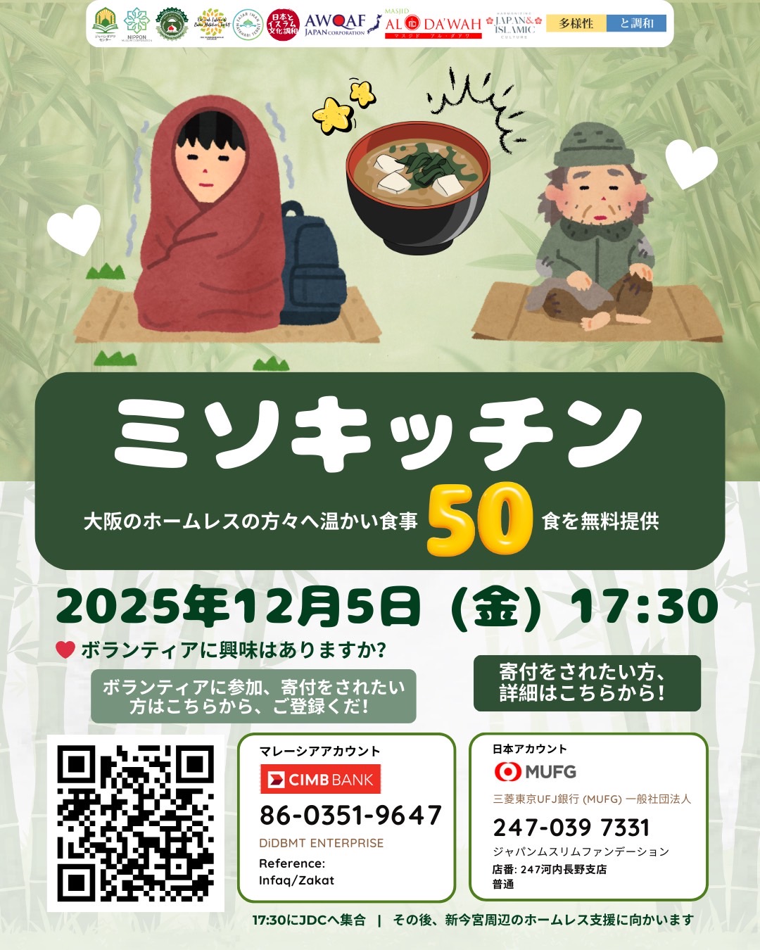 私たちは、寒さや孤独と闘う大阪のホームレスの方々に、少しでも温かさと優しさを届けるために、50食の温かい味噌汁を無料提供する「ミソキッチン」活動を行います。